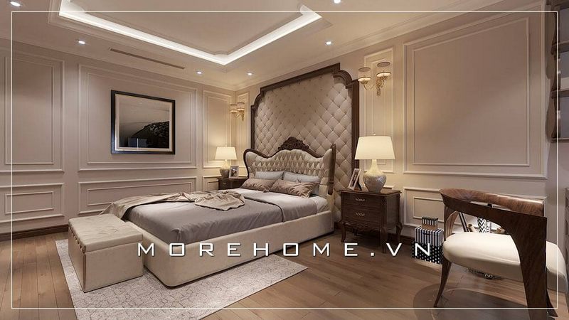 Giường ngủ gỗ óc chó bọc da cao cấp đầy sang trọng, phần nút chần đính khuy tỉ mỉ, sắc nét được gia chủ lựa chọn và vô cùng hài lòng
