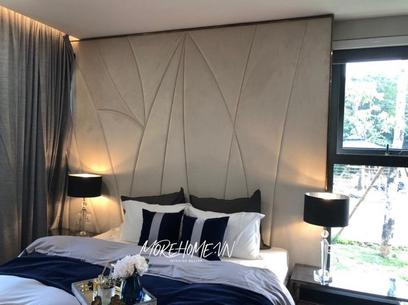 Mẫu thiết kế đầu giường bọc nỉ màu be độc đáo cho phòng ngủ hiện đại