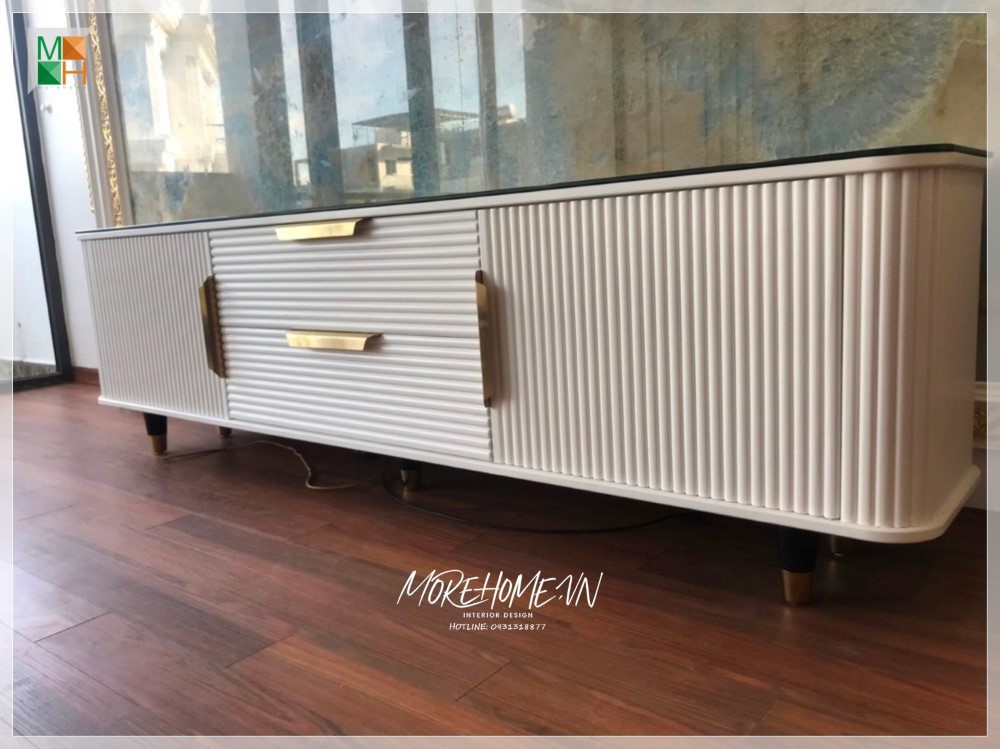 Cận cảnh từng đường nét kệ tivi tân cổ điển, toàn bộ thân và mặt cánh được soi bán nguyệt kết hợp với nước sơn trắng tạo nên một tổng thể mềm mại, nhẹ nhàng nhưng không kém phần tinh tế