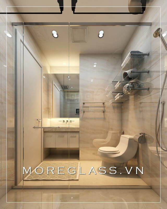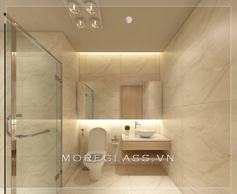 Mẫu thiết kế phòng tắm đơn giản được kết hợp với kệ tủ và các thiết bị vệ sinh cao cấp, nhỏ gọn.