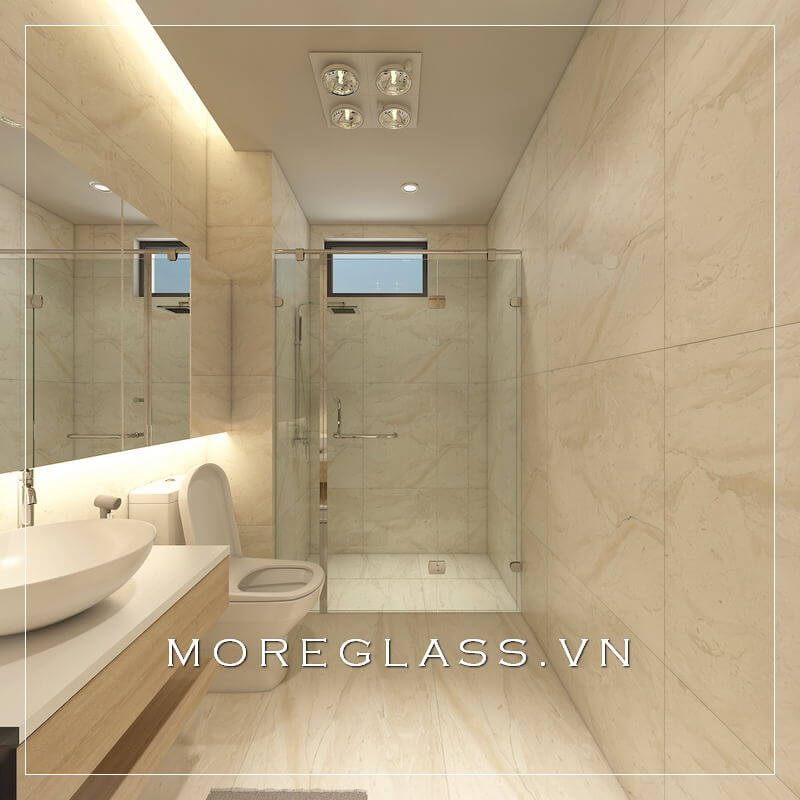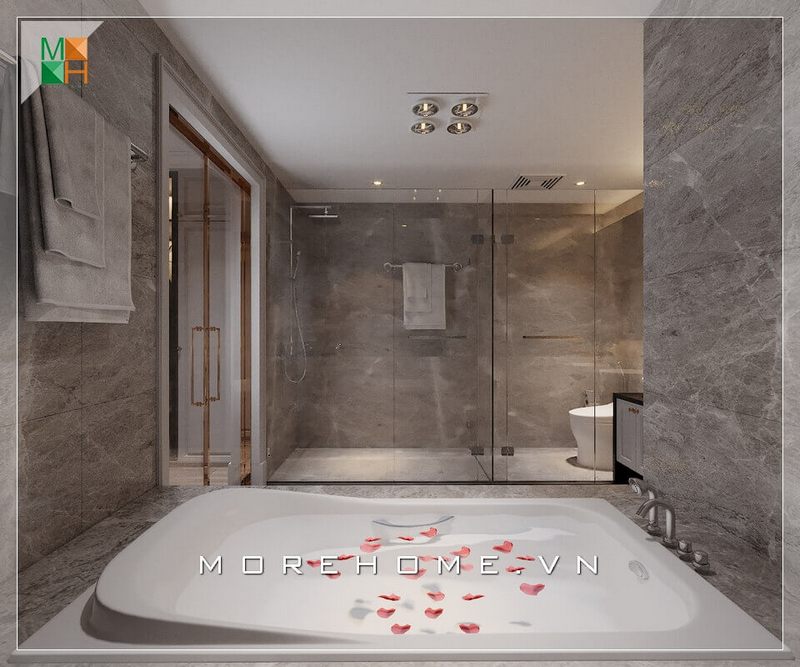 Nhà tắm và WC được phân chia bởi một vách kính cường lực để tạo ra một thiết kế nhà tắm thông minh và sang trọng.